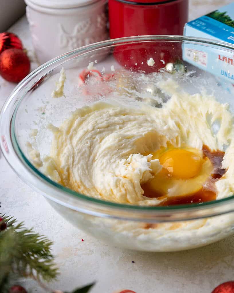 Add in 1 egg, 2 tsp peppermint extract, and 2 tsp vanilla bean paste or vanilla extract. Mix on a medium speed until incorporated.