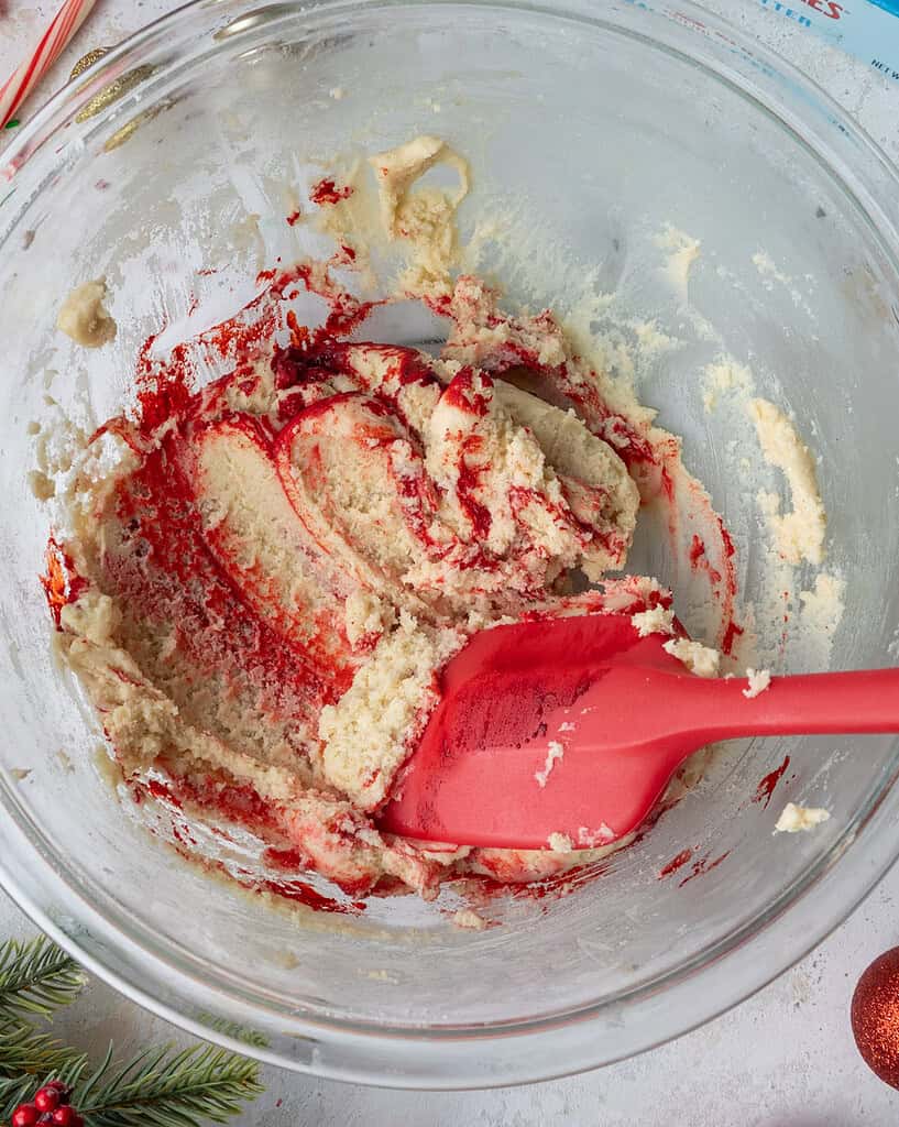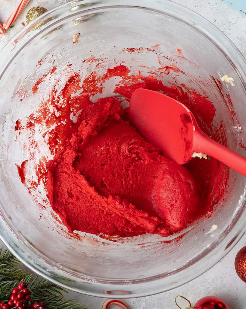 Color the remaining dough red with a generous squirt of red gel food coloring (if you use liquid food coloring, use 1 Tbsp). Mix until the dough is just evenly colored.
