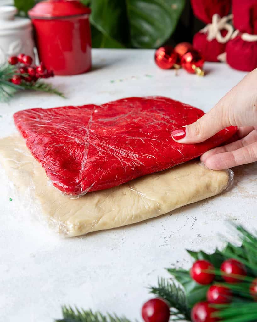 Spread out a long piece of plastic wrap and scoop half of the uncolored dough onto it. Flatten the dough into a rectangle that’s about 1/4 inch thick, then wrap the dough tightly and place it in the fridge to chill.
