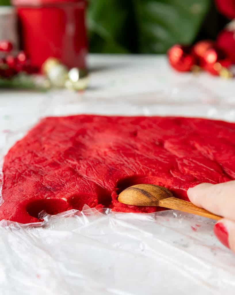 - Color the remaining dough red with a generous squirt of red gel food coloring (if you use liquid food coloring, use 1 Tbsp). Mix until the dough is just evenly colored. Flatten the dough into a rectangle that's about 1/4 inch thick on a piece of plastic wrap. Wrap the dough tightly and place it in the fridge to chill.