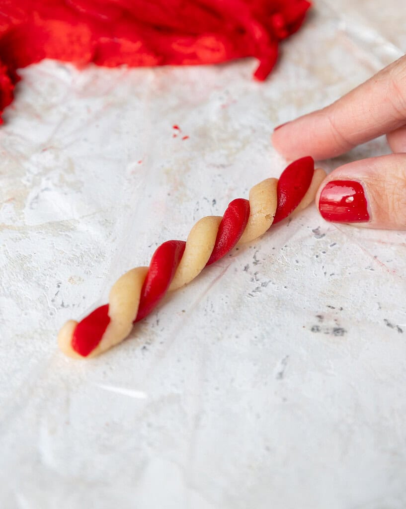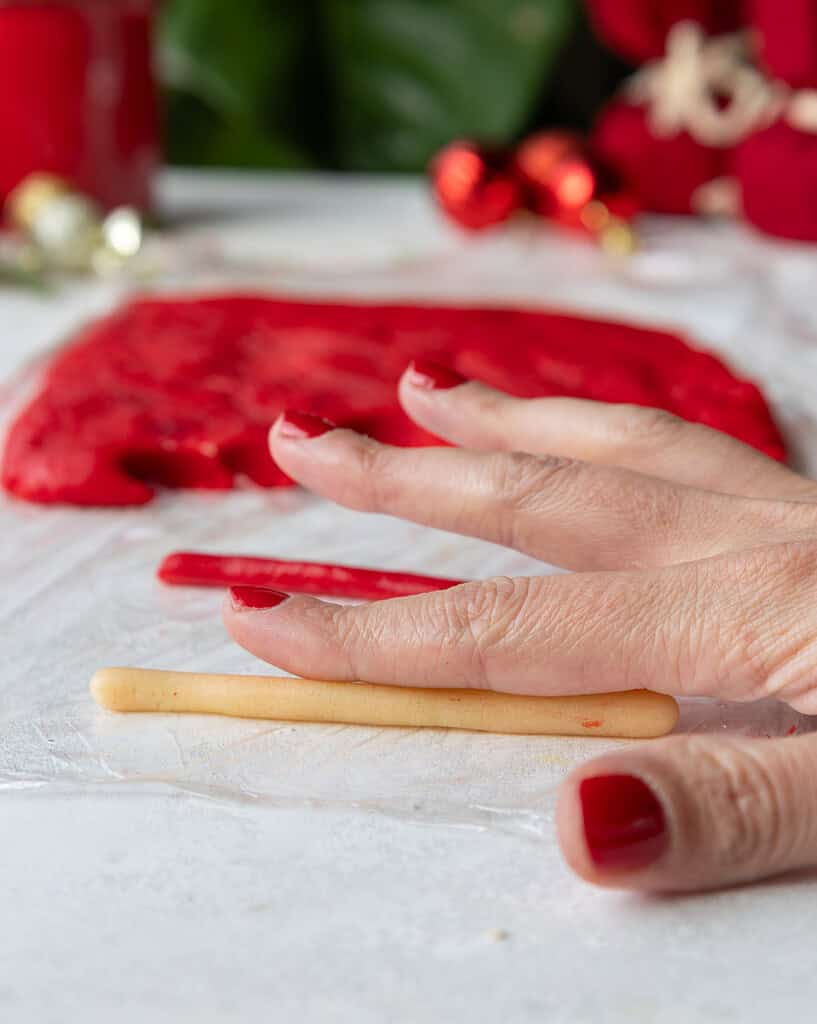 - Unwrap each portion of cookie dough so that it's sitting on top of the plastic wrap. Use a 1/2 teaspoon measure to scoop a portion of red and white dough, then use your hands to roll the dough out into thin strands that are about 4 inches long.