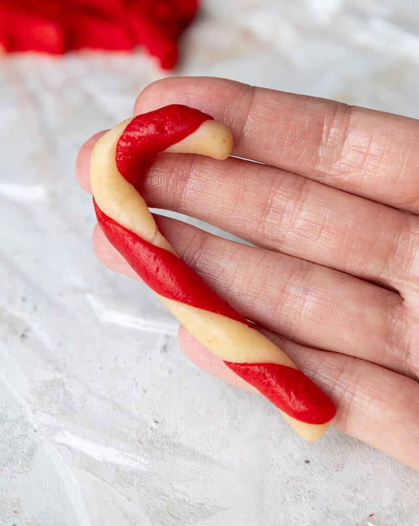 - Twist the two strands of dough together to look like a candy cane. Then gently roll the strips of dough together to smooth them out and move the dough into the shape of a candy cane. This can take a little bit of practice, so don't get discouraged if your first few are a little wonky! It gets easier the more you make! The cookies don't spread much as they bake, so you can place them about 1 inch apart on the prepared baking sheets. I was able to fit about 30 per sheet.