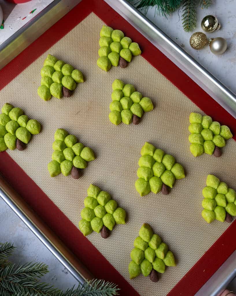 - Then, scoop about 1/8 teaspoon (I fill 1/4 tsp measure halfway) of brown dough and use your hands to roll the dough into the shape of an elongated teardrop. Place this at the bottom of the cookie, in the middle of the four bits of green dough, to look like a tree trunk. Repeat this process, making one tree at a time to prevent the bits of dough from drying out.