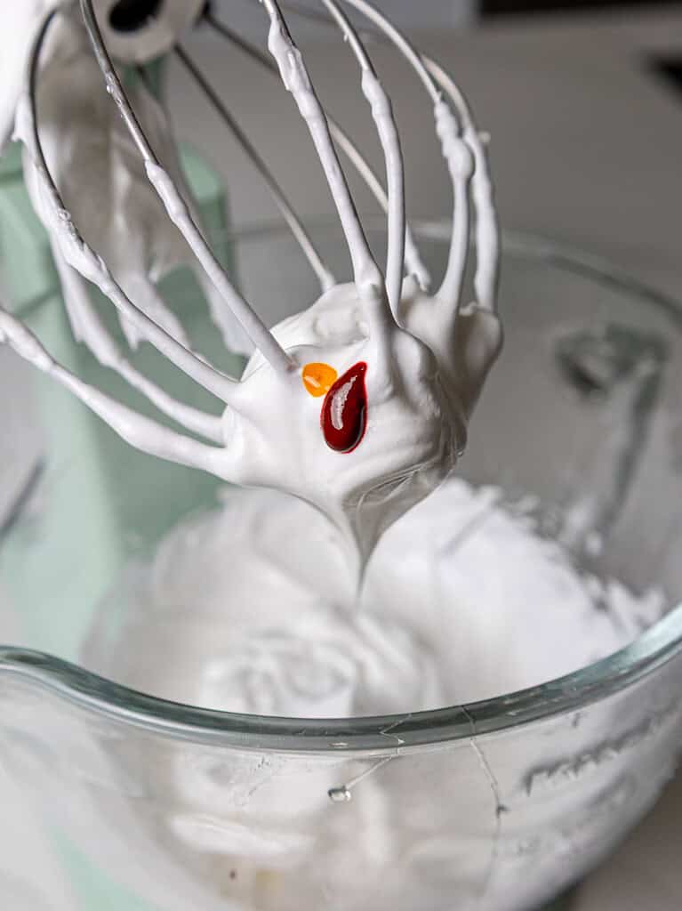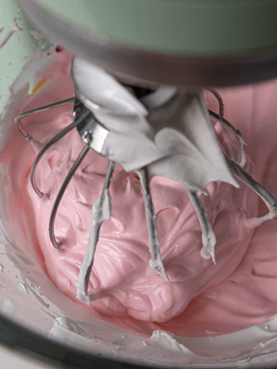 If you want a slightly warmer pink, you can also add a tiny drop of yellow gel food coloring (about 1/4 of the amount of pink food coloring). Keep mixing until stiff, glossy peaks form.