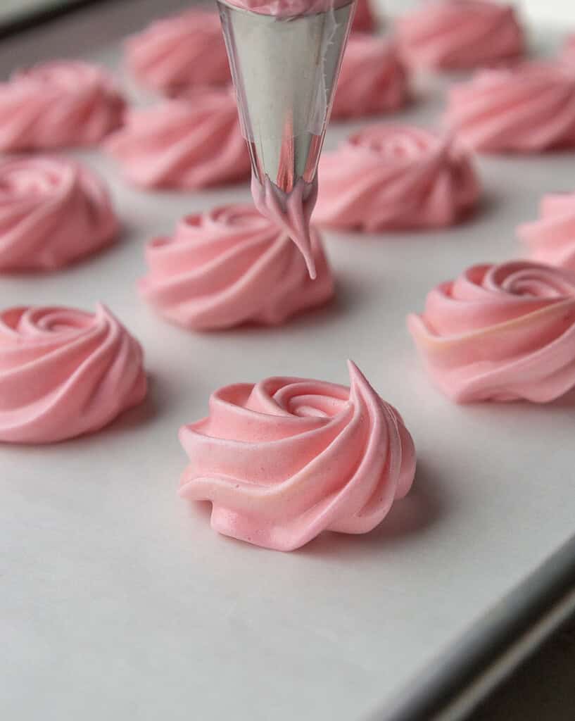 - Immediately pipe the roses once the meringue is colored. The meringue loses its structure as it sits, so you want to pipe it right away. Start in the center, then slowly pipe a swirl, working your way out from the center (see pictures above for reference). These don't spread as they bake, so they can be piped about 1 inch apart.